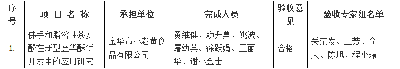 根據(jù)《金華市級科技計劃項目驗收管理辦法》(金市科字〔2015〕83號)規(guī)定,現(xiàn)將金華市小老黃食品有限公司承擔(dān)的《佛手和脂溶性茶多酚在新型金華酥餅開發(fā)中的應(yīng)用研究》市級科技計劃項目驗收結(jié)果予以公示,接受社會監(jiān)督,公示期從2018年8月21日至2018年8月28日止。任何單位和個人對驗收意見持有異議的,應(yīng)當(dāng)在公示期內(nèi)書面向市科技局提出異議,單位應(yīng)采用書面形式并加蓋公章,個人應(yīng)采用實名提出異議。