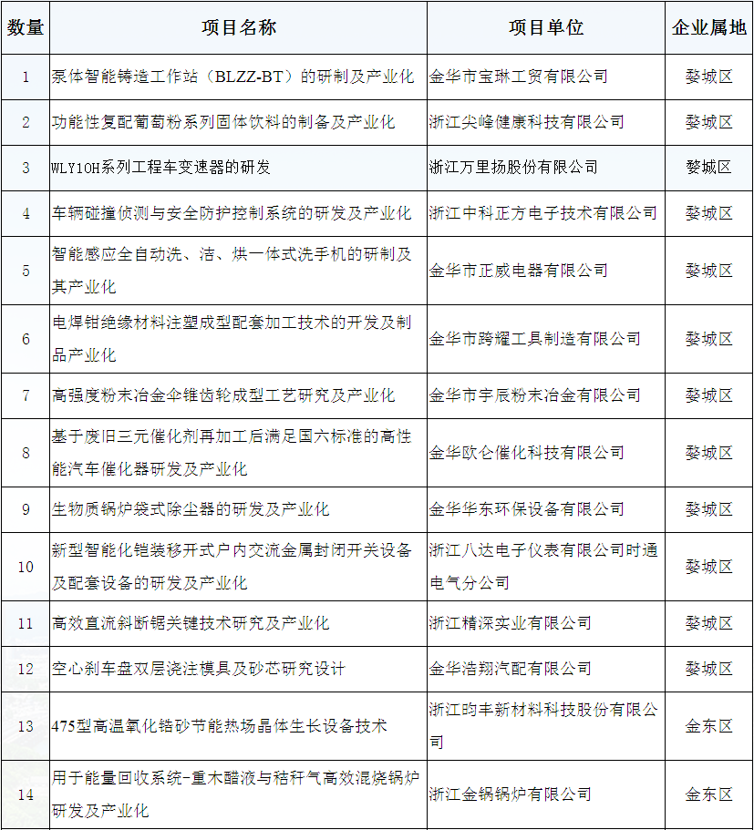 金華市2019年技術(shù)創(chuàng)新項目立項公示名單