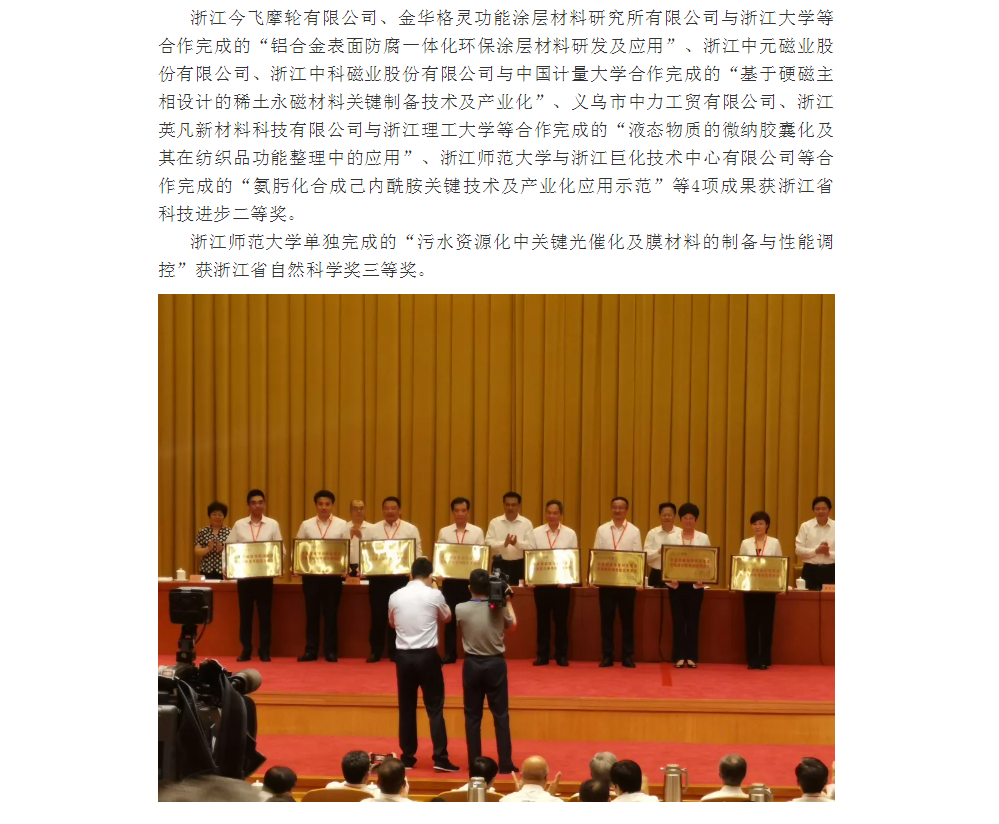 浙江萬里揚(yáng)股份有限公司牽頭與北汽福田汽車股份有限公司、金華市計(jì)量質(zhì)量科學(xué)研究院等合作完成的“商用車變速器輕量化、模塊化技術(shù)的研究及產(chǎn)品開發(fā)”、橫店集團(tuán)東磁股份有限公司單獨(dú)完成的“無線充電用高磁導(dǎo)率FS500鐵氧體片”、浙江道明光電科技有限公司與道明光學(xué)股份有限公司完成的“符合ECE R104微棱鏡型反光膜關(guān)鍵技術(shù)研發(fā)及產(chǎn)業(yè)化”、金華市中醫(yī)醫(yī)院單獨(dú)完成的“脾腎陽虛血瘀型腎衰的理論基礎(chǔ)及腎毒寧方干預(yù)機(jī)制研究”、金華市公路與運(yùn)輸管理中心牽頭與東南大學(xué)等合作完成的“浙江省重載干線公路車轍機(jī)理與路基路面一體化防治技術(shù)”、浙江綠巨人生物技術(shù)有限公司與浙江大學(xué)等合作完成的“適宜糖尿病食用高抗性淀粉水稻種質(zhì)創(chuàng)制、機(jī)理特性及產(chǎn)業(yè)開發(fā)”、義烏市中醫(yī)醫(yī)院與浙江省立同德醫(yī)院合作完成的“丹溪學(xué)派的傳承發(fā)展與著述研究”、金華市農(nóng)業(yè)科學(xué)研究院、金華市荊龍生物科技有限公司、浙江壽仙谷醫(yī)藥股份有限公司與浙江農(nóng)林大學(xué)等合作完成的“金線蓮優(yōu)異種質(zhì)創(chuàng)新及生態(tài)栽培關(guān)鍵技術(shù)研究與應(yīng)用”、國網(wǎng)浙江省電力有限公司金華供電公司與杭州電力設(shè)備制造有限公司等合作完成的“新型開關(guān)設(shè)備態(tài)勢感知與智能運(yùn)維關(guān)鍵技術(shù)及產(chǎn)業(yè)化”、東陽市人民醫(yī)院與杭州電子科技大學(xué)等合作完成的“面向健康養(yǎng)老的人機(jī)共融智能監(jiān)陪護(hù)系統(tǒng)關(guān)鍵技術(shù)及應(yīng)用”、浙江凱文磁業(yè)有限公司與中國計(jì)量大學(xué)等合作完成的“新能源汽車用高耐熱沖擊釹鐵硼關(guān)鍵制備技術(shù)及其電機(jī)應(yīng)用”、浙江師范大學(xué)與杭州醫(yī)學(xué)院等合作完成的“基于浙江實(shí)踐的農(nóng)村衛(wèi)生發(fā)展策略研究”等12項(xiàng)成果獲浙江省科技進(jìn)步獎(jiǎng)三等獎(jiǎng)。